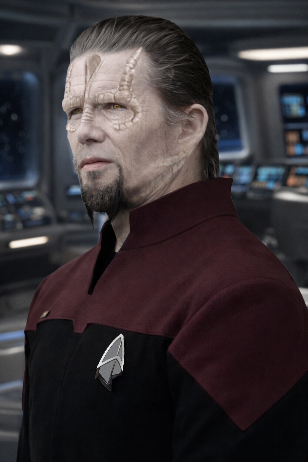 | Personal History | His father, Gul Krenn Kudred, was the overseer of one of the many mining outposts littering the subjugated world of Bajor within the Cardassian Union. A career soldier from a wealthy and ancient Cardassian family, Gul Kudred Gul Krenn Kudredruled his region strictly and without remorse. A firm believer in the racial superiority of his people and their right to rule over others, Gul Kudred did not balk at the notion of taking Valyn Karem, a young Bajoran woman, as one of his many comfort women during his tenure overseeing the region. An otherwise austere man, the gul was careful to be discrete in his dealings with the young Karem. Shortly after taking Karem as is favoured concubine, she fell pregnant, a fact she strove to keep hidden from the gul. When it became impossible to conceal the fact, Karem did all she could to escape Gul Kudred and moved around Bajor as much was possible during the Occupation. Valyn has little to no recollection of his first three years of infancy on his mother’s homeworld, before Karem was sold out by collaborators to the Cardassian overseers. However, the Prefect of Bajor was a political rival of Gul Kudred’s, and so rather than hand over both the Bajoran woman and her hybrid child, he made public the knowledge of the gul‘s bastardborn son and permitted Karem to ‘escape’. With the political backlash of the incident, Gul Krenn Kudred was forced to relinquish his role on Bajor and return to Cardassia Prime. However, Krenn was either unwilling or unable to bring himself to kill or abandon his son, his own flesh and blood, and so despite the taboo it represented, he brought young Valyn back to his estate on Cardassia with him in 2358, and resolved to raise him as his own. Life on Cardassia Although Gul Kudred had not killed or abandoned Valyn, even at the expense of his own career (he had been informed in no uncertain terms that he would never progress to Legate, as had been expected), he did not raise him with love. Whilst he had everything provided for him and was raised with the expectations of a Cardassian soldier, Valyn was reminded at every turn that he was impure – not a true Cardassian. His siblings, with the exception of his half-sister, largely ignored or bullied him in their younger years, and his step-mother had nothing but resentment for the bastard-born alien that brought such shame to the family. Even so, Gul Kudred managed to preserve as much of his reputation as was possible at the time, and continued to serve the government in advisory and tactical capacities. Throughout his childhood, Valyn was kept mostly within the estate but away from main family events. He was expected to study and prepare for a life of military servitude (as a rank outsider, still) and he devoted himself to this wholly. Although largely accepting of his half-breed nature and therefore his limitations in Cardassian society, when he was able to glean information of the wider galaxy, he soaked up the information, particularly when it related to Bajor or the Federation. During all of this, his father only paid him a modicum of attention, but would always seek to challenge his knowledge, making it clear that there were expectations of a gul’s son, but also that as a bastard, Valyn would have to work harder. Through all of this, even when dismissive, Gul Kudred would offer the solace: “But you are still my son”, for whatever that may have counted. His older brothers joined the military before he was of an age himself, and the eldest died during the shortlived Klingon-Cardassian War, which only served to incense Gul Kudred’s hatred of aliens further. When Cardassia joined the Dominion and the war against the Federation, he deemed it a positive thing and was hopeful for Cardassia’s ascendancy as the principle power of the quadrant. However, as the war turned sour and it became apparent the Dominion was due to lose and they turned their guns on the Cardassian people, it was Gul Kudred’s second son that died as the Jem’Hadar began marching through the streets and military installations, scouring them of any threats. Although it was the Dominion who killed his second son, Gul Kudred remained committed that the period of democratisation and UFP involvement that followed was anathema to the Cardassian way, and he largely blamed the Federation and Klingons for what became of his world. Joining Starfleet Raised with the views of becoming a military man but tempered by his (taboo) studies of other worlds and beliefs, Valyn Kudred – who had been appalled by the state of affairs brought about by the Dominion War – was among those most pleased when the Federation came to his world and information from beyond the Union’s borders finally reached the ears of the common man. Despite the protestations of his father, Valyn Kudred charted passage from Cardassia to the Bajor sector, freeing himself for the first time from the shackles of his father, who resigned himself to an advisory role to the new civilian government. Seeking information relating to his mother, Kudred made contact with his maternal aunt and her husband, who were surprisingly welcoming to their Cardassian nephew. Although distrusted by many around, the ridges of his nose helped temper many concerns he faced during his short stay at Bajor. At this time, Kudred struggled deeply with his identity. Having been raised purely as a Cardassian gul‘s son, balanced as this was by his own studies of extraterrestrial books and data, he now found himself on Bajor, surrounded by a new, very different family and unable to decide what future should await him. At the suggestion of his aunt after many discussions where Kudred spoke of his admiration for Starfleet, he sought out support from a local officer and submitted his candidacy. Within a few months, Cadet Kudred attended Starfleet Academy on Earth, yet another planet so alien to him. Early Starfleet Career (2375-2392) Kudred undertook tact
